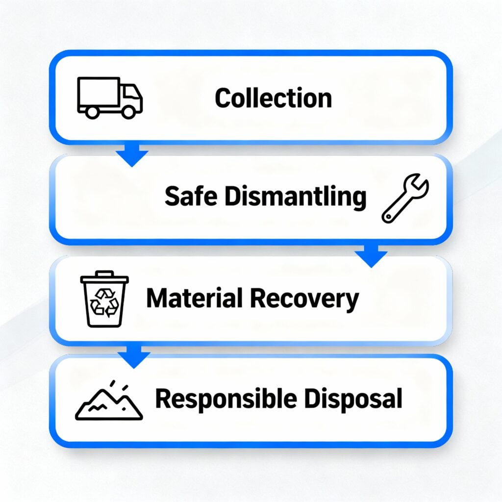 Our process ensures safe segregation, material recovery, and disposal of non-recyclables in compliance with India’s e-waste management rules.