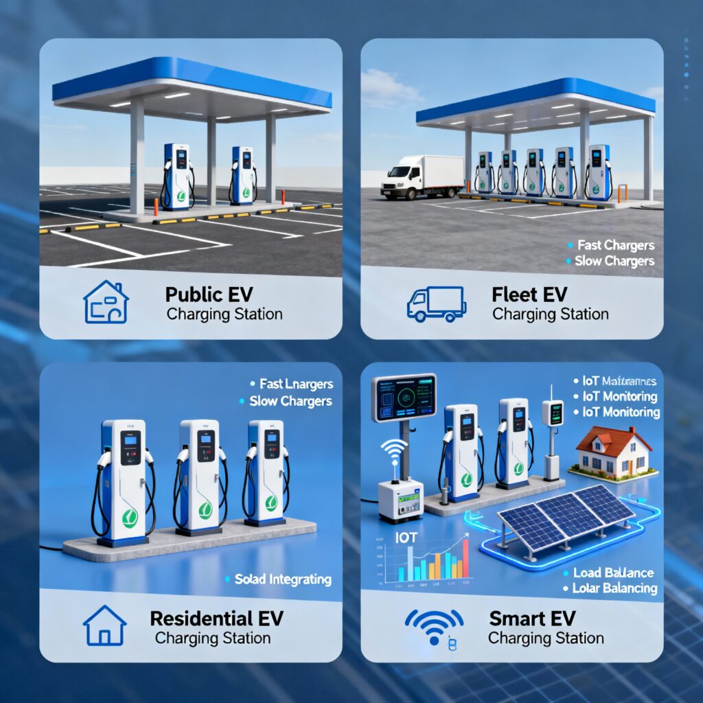 Public Charging Stations: Fast and slow chargers for 2W, 3W, and 4W vehicles